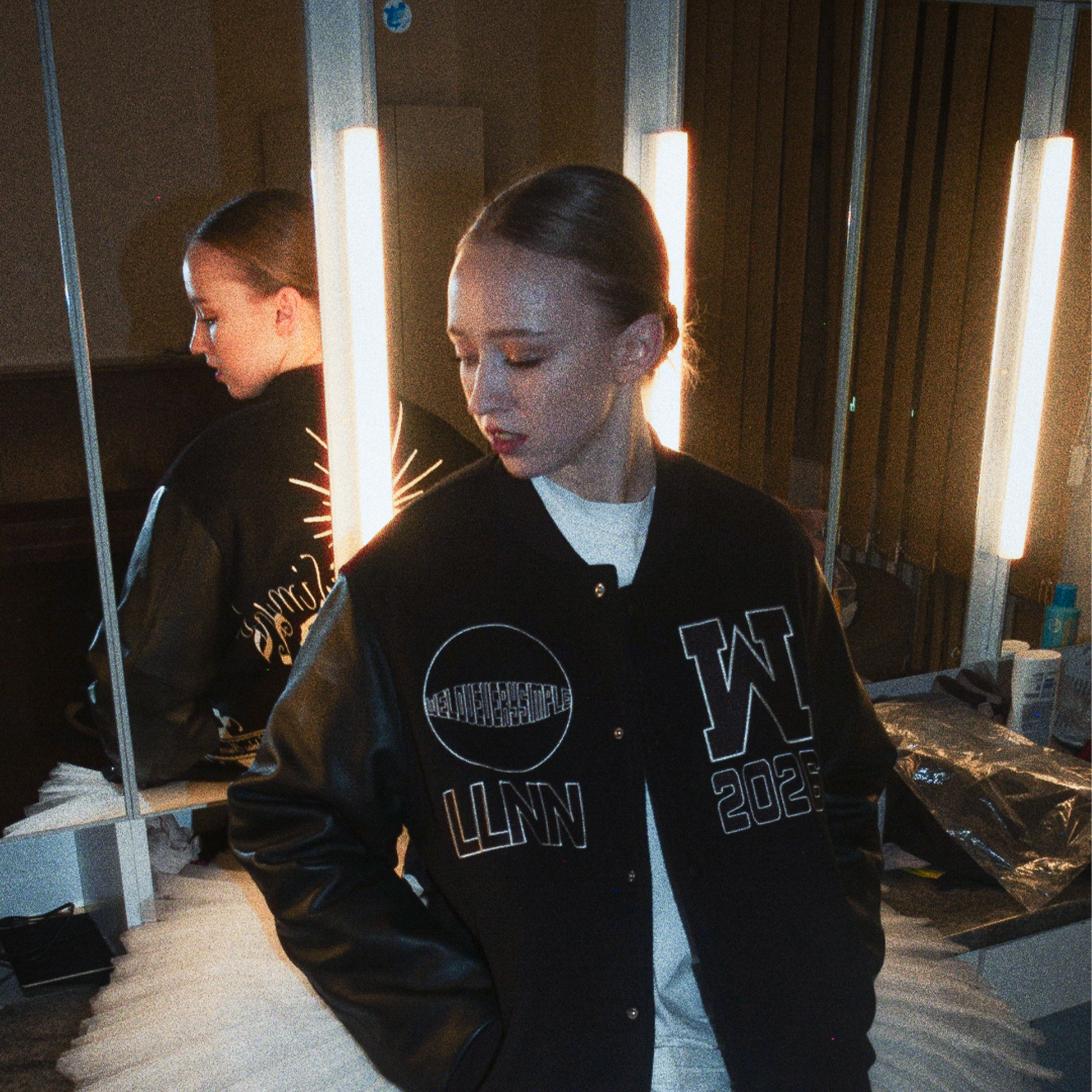 Vyrobená z vlnenej tkaniny s koženými rukávmi a detailami.